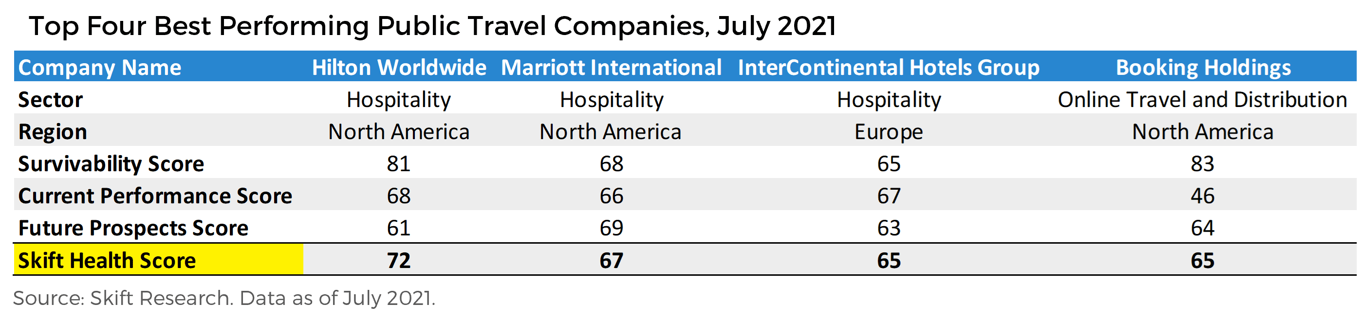 Hilton held onto its number one spot to remain the best scoring public company in travel for the Skift Health Score updated through July. Marriott, previously in fourth place, rose to be our second best travel stock. Intercontinental Hotels Group saw the largest gain among the top four, climbing seven spots to be the third best performing company in travel. Booking Holdings rounded out the top four, though dropping two spots from last quarter.